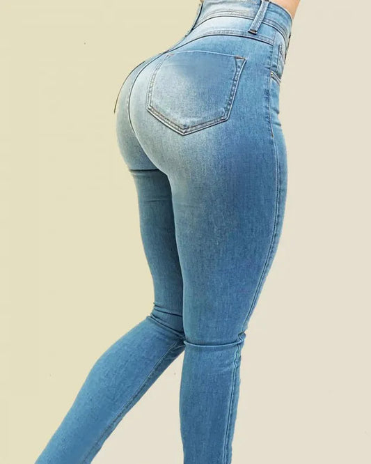 Vaqueros ajustados con cintura alta y realce de cadera y botonadura delgada